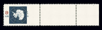 1023 nh 1431b image#1431b, 8c Antarctica Treaty, both colors missing, in horizontal right-margin se-tenant pair with a partial printed stamp (due to foldover), o.g., n.h., very fine. (Image) $500.00