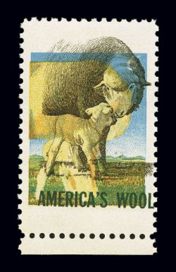 1024 nh 1423b image#1423b, 6c America's Wool, teal blue omitted bottom margin single of this dramatic error caused by an upward shift of the teal blue color, o.g., n.h., trivial fingerprint on gum, extremely fine; undercataloged in Scott, as only 6-8 examples have been reported according to Datz. (Image) $600.00