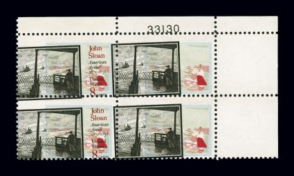 1025 nhPB 1433b image#1433b, 8c Sloan, engraved red omitted, the error caused by a spectacular misregistration of the engraved red color, being shifted on to the adjoining stamps at left, top right plate no. 33130 block of four, o.g., n.h., fine; a very rare and seldom seen error, especially in a plate block; listed but unpriced in Scott. (Image) Est. 2,000-3,000