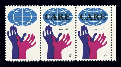 1026 nh 1439a image#1439a, 8c CARE, black omitted, single error in a horizontal strip of three, with the other two stamps having the black partially omitted, o.g., n.h., extremely fine; very rare, with only ten examples existing in any format. (Image) $2,750.00
