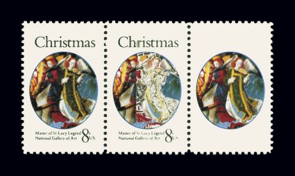 1028 nh 1471b image#1471b, 8c Christmas, black omitted, impressive transitional strip of three, the left stamp normal, the middle stamp with black partially omitted, and the right stamp with the black completely omitted, o.g., n.h., very fine and rare; only 10 examples exist; 1982 APS certificate. (Image) $3,500.00