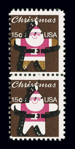 1037 nh 1800a. 1800b image#1800a, 1800b, 15c Christmas, green and yellow omitted, and green, yellow and tan omitted, vertical pair containing one of each error, centered to the left and with other colors misaligned as always, o.g., n.h., fine; only ten combination error pairs exist; not listed as such in Scott. (Image) Datz $1,500.00
