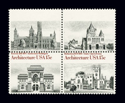 1038 nhbl 1841b image#1841b, 15c Architecture, se-tenant block of four, red omitted from top stamps, caused by a perforation shift, with the red inscriptions from the top stamp appearing on the bottom stamps, o.g., n.h., very fine; a scarce error. (Image) $400.00