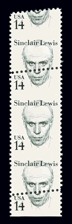 1040 nh 1856d image#1856d, 14c Sinclair Lewis, vertical pair, imperforate between, one such pair in a vertical strip of three, with the horizontal perforations on the other stamps misaligned, o.g., n.h., very fine; an eye-catching error, with only 15-20 reported to exist. (Image) $2,000.00