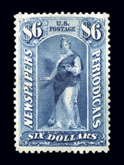 1183 og PR73 image#PR73, $6.00 Blue, a gorgeous mint single, featuring eye-catching intense color and an especially vivid impression, plus it is uncharacteristically well centered within exceptionally large margins, full o.g., lightly hinged, extremely fine; a very scarce stamp in this choice quality; 2001 PF certificate. (Image) $950.00