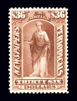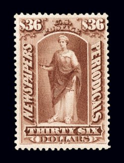1187 og PR77 image#PR77, $36.00 Indian red, a premium mint example of this scarce newspaper stamp, being quite well centered within large margins, rich vibrant color, full o.g., lightly hinged, very fine and choice; 1999 PF certificate. (Image) $850.00