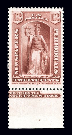 1188 nh PR82 image#PR82, 12c Carmine, an incredibly fresh and choice bottom margin partial imprint example of this value, in a quality which few newspaper stamps can be found, with lovely bright color and impression on immaculate paper, extraordinarily well centered within uncommonly large margins, pristine o.g., n.h., extremely fine; photocopy of a 2004 for a block of twelve from which this was taken. (Image) for hinged $165.00