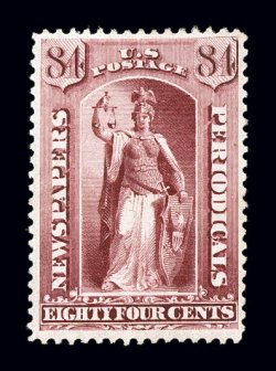 1189 og PR88 image#PR88, 84c Carmine, a remarkably fresh mint single, with especially deep intense color and impression, well centered, fresh o.g., relatively lightly hinged, choice very fine; 2002 PF certificate. (Image) $725.00