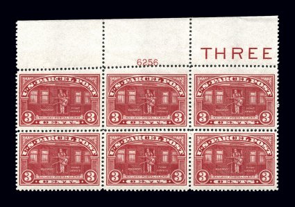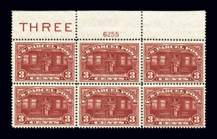 1198 ogPB Q3 image#Q3, 3c Parcel Post, full top margin imprint and plate no. 6255 block of six, well centered (especially the middle stamps), rich bright color, o.g., n.h. except for a tiny hinge sliver reinforcing a couple perforations at top right in the ungummed portion of the selvage, very fine. (Image) $260.00