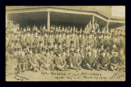 1291 c imagePost card collection of what the collector identified as rare and expensive cards, it might be better described as unusual cards and the ones that he was particularly attracted to, but there are over 275 view cards of a more desirable and eclectic nature including sports cards featuring pictures of early local baseball teams and a series of six humorous cards with a baseball theme, other types of cards include bicycles, autos, steam engine tractors, San Francisco earthquake, various patriotic cards including those with famous people, some presidential items, including a 1909 actual photo card of President "Teddy" Roosevelt with his neighbors at Oyster Bay taken by photographer W. Pickering and signed by him, plus many other just interesting things, besides the post cards there are few other items of paper memorabilia including photos, autographs, an advertising card for Parker Guns, etc., condition is mixed with some faults, but many fine-very fine and desirable items. (imagea) (imageb) (Image) Est. 500-750