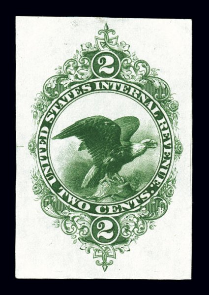1307 E Turner Model Ty. H imageTurner Model Type H, 2c Black, pencil and wash drawing, plus engraved lathework and sepia photograph of eagle pasted on card, 76x110mm, with several manuscript notations including "Approved E.A. Rollins, Commissioner Int. Rev" at right and "Office of Int. Rev./February 12/67", very fine; the unique model essay for this design; ex-Deats and illustrated in Turner on page 102. (Image) Est. 2,000-3,000