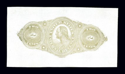 1305 P Proof Ty. F imageProof Type F, 2c Orange, die proof on wove cream paper, similar proof to the above with light black frames printed around the border as might be found on a check, but without the security prints, 187x72mm, light paper wrinkles near the edges, very fine and quite scarce; not listed in Turner nor was any proof of type F present in the Joyce Sale. (Image) Est. 200-300