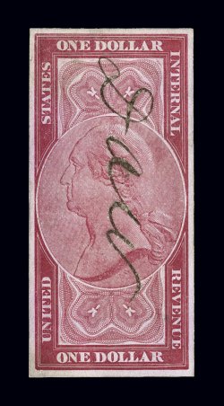 1341 P Turner Proof Ty. Wc, Wd imageTurner Proof Type Wc, Wd, $1.00 die proofs in five different colors, cut to stamp size (approximately 37x79mm) with clear margins all around except one which is cut to the design, includes rose on violet surface tinted paper with ms. "Daw" initials, the other four in brown, green, red and an unlisted blue, all overprinted with vertical lines in different colors and patterns, each with small thins and other minor flaws, overall attractive with very fine appearance; scarce; ex-Joyce for the brown, green and red. (Image) Est. 500-750