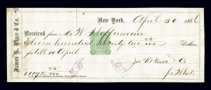 1351 c RN-A9 image#RN-A9, 2c Green, New York, New York, on 1866 receipt of "James R. Place & Co.", printed by P.E. Bogert, Stationer & Printer, some separation along vertical folds has been hinge reinforced on the reverse, not affecting the stamp imprint, otherwise nearly very fine for this very scarce color of the 2c type A design. (Image) $1,250.00