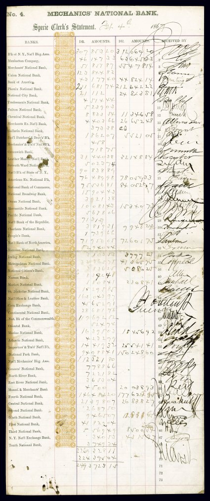 1352 c RN-A10 image#RN-A10, 2c Orange, "Tapeworm" of one full and 56 partial impressions, New York, New York, on 1867 "Mechanics' National Bank" specie clerk's statement, 56 banks listed at left corresponding to 2c tax for each, full document, some edge toning at left affecting the list of bank names, otherwise very fine and scarce as a full document. (Image) $750.00
