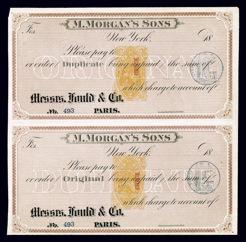 1354 ogc RN-B1d image#RN-B1d, 2c Orange, with 10c blue French handstamp at right, New York, New York, on colorful unused "M. Morgan's Sons" vertical pair of checks in red brown with vertical red "Check" over the stamp imprint, for "Messrs. Fould & Co." of Paris, imperforate, produced by the American Bank Note Co., barely noticeable closed edge tears at right and other minor edge flaws, otherwise very fine and attractive. (imagea) (Image) $800.00+