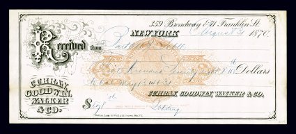 1358 c RN-C17 image#RN-C17, 2c Orange (salmon shade) with restrictive clause at base, New York, New York, 1870 receipt of "Curran, Goodwin, Walker and Co.", printed by Nathan Lane of New York, horizontal fold and usual vertical folds, not detracting, otherwise very fine; a scarce and eye-appealing receipt. (Image) $600.00
