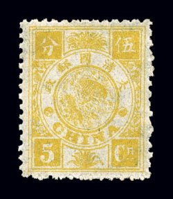 1582 og 20n image#20n, 1897 5ca Dowager, second printing, incredibly well centered single, radiant yellow color and bright white paper, and possessing attractive perforations, full o.g., lightly hinged, extremely fine; an especially select example of this value (Chan #26S; $550.00). (Image) $550.00