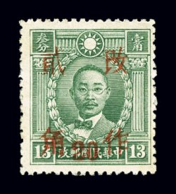 1681 ng 532(c20) image #532(c20), 1943 Hunan red 20c surcharge on 13c Green, unused, desirable single of this extremely rare 20c surcharge, bright colors and well struck surcharge, attractive fine centering which is very typical for this stamp; a key value of these challenging surcharges that is missing from most collections (Chan #690; $1,200.00) (Image) $1,000.00