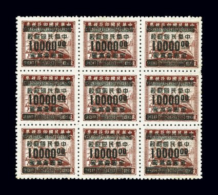 1687 ogbl 937 var., 942 var. image#937 var., 942 var., 1949 $10,000.00 Gold Yuan surcharge on $20.00 Revenue, third character "Yuan" instead of "Kuo", variety is the center stamp in a block of nine, similar block of nine of $50.00 on $10.00 Revenue with third character "Kuo" inverted, both blocks are well centered and very attractive, very fine-extremely fine; not listed in Scott (Chan #G117b, G122b). (Image) Chan $425.00