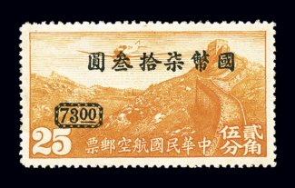 1690 og C42 image#C42, 1946 $73.00 on 25c Orange Air Post, unwatermarked, perforated 14, magnificent mint example of the key air post issue of China, possessing virtually perfect centering within incredibly large lavish margins, brilliant orange color, full o.g. with just a trace of hinging, extremely fine gem; we doubt that a nicer example of this rare stamp could be found (Chan #A47; $1,600.00). (Image) $1,300.00