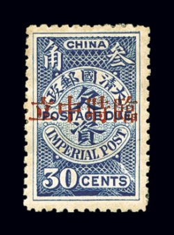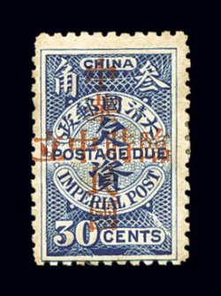 1691 ng Chan #DU1 imageChan #DU1, 1911 1/2c Brown postage due, unissued value, unused, without gum, beautifully centered, brilliant orange brown color, extremely fine and exceptionally rare; in 1911 a new order was made with Waterlow for six values of postage dues with the instruction to change the color from blue to brown, the 1c and 2c values in brown arrived first and were issued, the 1/2c, 4c, 5c and 20c did not arrive until after the Manchu government had been overthrown and the Republic instituted, these four values were immediately issued with Republic of China overprints, only a very few unoverprinted stamps found their way into collectors' hands making them exceedingly elusive and seldom offered; listed but not priced in Chan, not listed in Scott but mentioned in a footnote after #J16. (Image) Est. 400-500