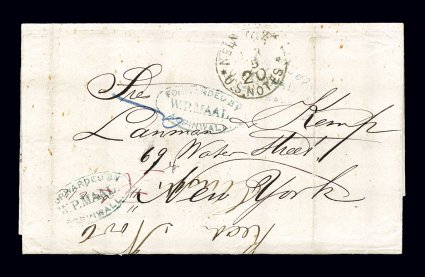1698 c image1872 Stampless letter to New York, two page letter datelined "Barranquilla, 25 de Octobre, 1872", with multiple strikes of blue "Forwarded by W.P. Maal Aspinwall" oval handstamps, "New York/U.S. Notes/20" c.d.s., very fine. (Image) Est. 150-200