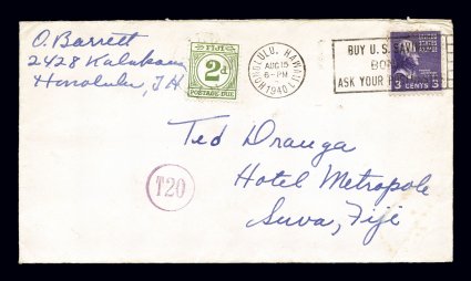 1699 c J13 image#J13, 1940 2p Bright green postage due, tied by Suva Sep. 10 (1940) c.d.s. on cover sent from Hawaii, with U.S. 3c Presidential (#807) tied by Aug. 15, 1940 Honolulu duplex, violet "T20" in circle, Suva 3 Sep.,1940 backstamp, very fine; Scott prices the postage due stamp on cover at $600.00, however they have a footnote "Virtually all covers with Nos. J12-J19 are overfranked and of philatelic origin. The values above are for such covers."; a proper commercial postage due usage such as this is actually very rare (S.G. #D12; from £900). (Image) Est. 1,000-1,500