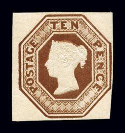 1702 og 6 image#6, 1848 10p Red brown, die 4, clear to large margins all around which is most unusual on these embossed issues, as the very narrow space between stamps usually results in one or more sides being cut into, strong rich color and detailed embossing, full original gum, mild h.r., very fine; it is very rare to find this stamp both with four margins and still retaining its original gum; 1979 BPA certificate (S.G. #57; £4,250). (Image) $4,600.00
