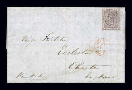 1704 c A6 image#A6, 1856 6p Lilac of Great Britain, an especially well centered example with central "A15" in bars oval cancel, on 1859 folded cover datelined "Carriacou, Grenada/20 May 1859", lacking the Grenada c.d.s. usually found on the reverse, perhaps because this was from the small island of Carriacou, appropriate London paid c.d.s. and backstamped Chester, extremely fine and rare posting (S.G. #Z4). (Image) Est. 300-400