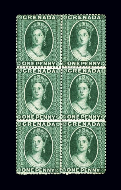 1705 ogbl S.G. #10 image#5B, 1873 1p Deep green, clean cut perf. 15, wmk. sideways small star, fresh mint block of six (2x3), remarkably well centered for a block of this issue as the space between designs is often barely enough for even the tiny holes of this perforation gauge, bright rich color, o.g., minor h.r., center pair never hinged, very fine-extremely fine; scarce in blocks; 1977 Brandon certificate (S.G. #10; £510+). (Image) $600.00