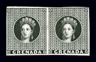 1706 P image1875 Undenominated Chalon Head plate proof, in black on stiff ungummed wove paper, horizontal pair, intense color and razor-sharp impression, well clear to large margins all around, fresh and very fine. (Image) Est. 150-200