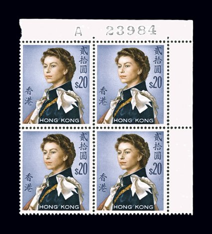 1708 nhbl 203-17 image#203-17, 1962 5c-$20.00 QEII definitives cplt. in blocks of four (top two values are corner margin blocks), o.g., n.h., $20.00 with mild gum bend that affects two stamps, very fine. (Image) $1,000.00+