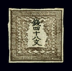 1709 og 1 image#1, 1871 48m Brown and black, on laid paper, plate I, position 39, unused, without gum as issued, wide margins all around, excellent impressions showing the variety of the secret mark and large extensions that are characteristic of this position, extremely fine; 1995 ISJP certificate (JSCA #1; Y45,000). (Image) $210.00