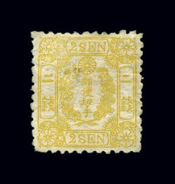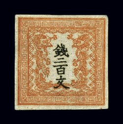 1711 og 3a image#3a, 1871 200m Vermilion and black, on wove paper, plate I, position 17, unused, without gum as issued, a marvelously choice example with four extra-large even margins, brilliant color and extra-clean impression, extremely fine in all respects; 1995 ISJP certificate (erroneously stating laid paper) (JSCA #3c; Y65,000). (Image) $375.00