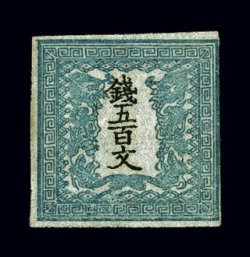 1713 ogbl 4 image#4, 1871 500m Blue green and black, on laid paper, plate I, unused, without gum as issued, a magnificent and rare block of six (2x3), positions 22-23/38-39, clear to large margins virtually all around just touching the frame lines of the top right stamp at a couple of points, bright blue green color on fresh paper, very fine-extremely fine; an incredibly handsome First Issue multiple of the key high value and seldom found any more in such a large multiple (JSCA #4; Y720,000 for block of four and two singles). (Image) for singles $2,400.00+
