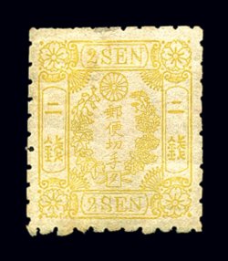 1722 og 28 var. image#28 var., 1874 2s Yellow, syllabic 16, on native wove paper, perforated 9 small holes, incredibly well centered mint single, plus surrounded by virtually full perforations, which rarely is the case with these widely spaced holes that do not allow for easy separation and thus was not much used, full crackly o.g., h.r., extremely fine; a terribly difficult stamp to find in this select condition; 2000 ISJP certificate (JSCA #22; Y80,000). (Image) $175.00