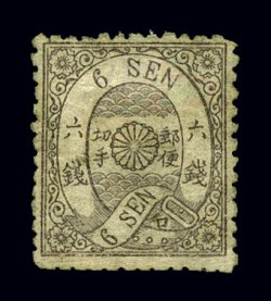 1725 nh 31 image#31, 1874 30s Gray, syllabic 1, on native wove paper, a pristine mint single possessing full crackly original gum that has never been hinged, remarkably fresh with strong dark gray color and prooflike impression, quite well centered, very fine; Japanese stamps from this very early period are seldom found in "post office" fresh condition, especially this rare high value, and are much scarcer than the modest premium given for never hinged by the specialized catalogs (JSCA #25; Y600,000). (Image) for hinged $2,400.00