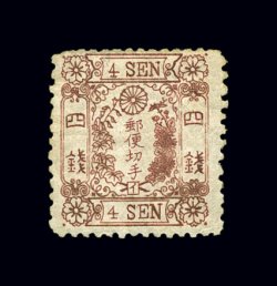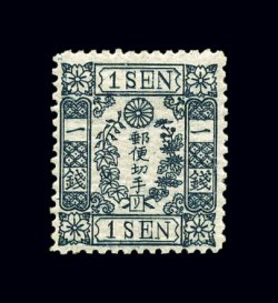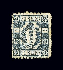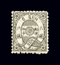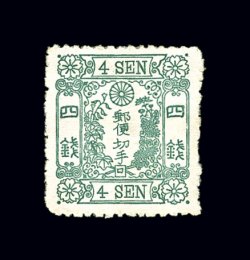 1724 og 31 image#31, 1874 30s Gray, syllabic 1, on native wove paper, a magnificent mint example of this rare high value, possessing numerous desirable features that are seldom found together on these early Cherry Blossom issues, including being beautifully centered within wide even margins, surrounded by full even perforations which rarely occurs on this fibrous native paper, fresh with bright color and detailed impression on clean white paper, full o.g., very lightly hinged; extremely fine; an exceptionally rare stamp and particularly so in this choice gem condition; signed Tyler and accompanied by a 2002 ISJP certificate (JSCA #25; Y500,000). (Image) $2,400.00