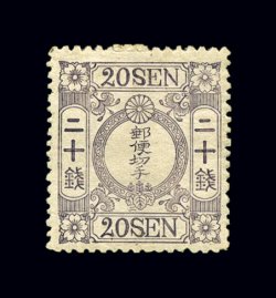 1732 og 38 image#38, 1874 20s Violet, syllabic 4, on foreign wove paper, attractive mint single in the lighter pastel shade, clean sharp impression, very well centered with nice full perforations, full o.g., light h.r., very fine and exceedingly choice; signed Tyler and accompanied by a 2002 ISJP certificate (JSCA #34; Y60,000). (Image) $200.00