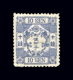 1727 og 33 image#33, 1874 1s Blue, syllabic 4, on foreign wove paper, lovely mint single, possessing exceptional freshness, bright blue color and crisp detailed impression, exceptionally well centered, full o.g., lightly hinged, extremely fine and attractive; 2002 ISJP certificate (JSCA #29; Y32,000). (Image) $125.00