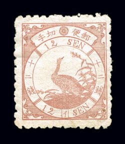 1742 og 46 image#46, 1875 12s Rose, syllabic 1, on foreign wove paper, exceptionally well centered mint single, lovely pastel rose color and a clean sharp impression, o.g., h.r., tiny natural inclusion and corner perf crease at bottom right, otherwise choice very fine and attractive (JSCA #36; Y70,000). (Image) $210.00