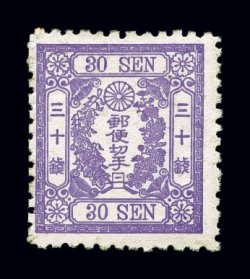 1744 og 49 image#49, 1875 30c Violet, syllabic 4, on foreign wove paper, exceptionally fresh color in a pretty pastel shade on bright white paper, quite well centered with full even perforations all around, disturbed part o.g., very fine and attractive (JSCA #48; Y35,000). (Image) $100.00
