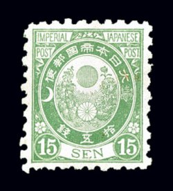 1746 og 52 image#52, 1875 4s Green, Ty. I, on foreign wove paper, exceptionally well centered mint single of this later value without syllabic, intense deep green color and sharp impression, full crackly o.g., lightly hinged, extremely fine; 2002 ISJP certificate (JSCA #40; Y50,000). (Image) $260.00