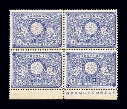 1753 og/nhbl 86 image#86, 1894 5s Twenty-fifth Wedding Anniversary of Emperor Meiji, perforated 12, bottom sheet-margin block of four with imprint, all four stamps are exceptionally well centered, rich color and fresh, o.g., three stamps are never hinged, top left stamp with tiny thin speck, otherwise extremely fine; Scott value is for four hinged singles (JSCA #C2; Y70,000). (Image) $140.00+