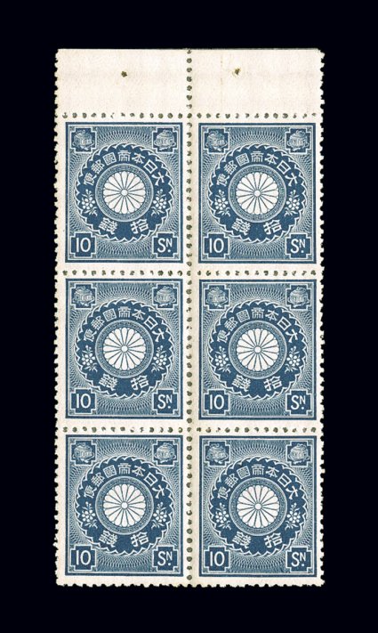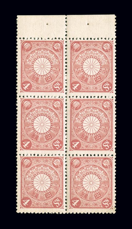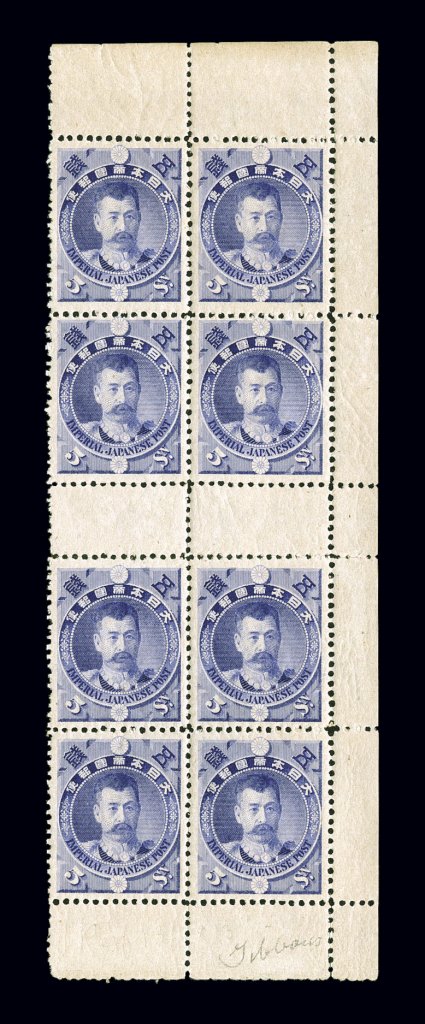 1754 nhbl 88 image#88, 1896 5s General Yoshihisa Kitashirakawa, line perforated 13, top right corner-margin gutter block of eight (2x4), with full selvage on three sides and gutter block of four in the center, strong color, very well centered overall, full o.g., n.h., typical weak perforations for this gauge and some separated perforations slightly affecting the gutter block, very fine-extremely fine and scarce position multiple; Scott value is for eight hinged singles (JSCA #C5; Y187,000 for hinged gutter block and four never hinged singles). (Image) $420.00+