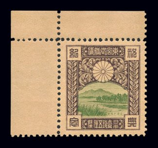 1776 nh JSCA #U2 imageJSCA #U2, 1923 3s Wedding of Crown Prince Hirohito, unissued value, impressive top left corner-margin mint single of this pretty stamp printed in violet and green on salmon colored paper, especially fresh, o.g., n.h., extremely fine; one of four values that were printed in very limited quantities for the Prince's Wedding and never issued, very rare. (Image) JSCA 180,000Y