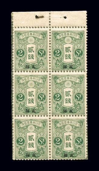 1845 nhBP JSCA #OBP7 imageJSCA #OBP7, 1913 2s Green with China overprint, unwatermarked, handmade booklet pane of six, an incredibly rare booklet pane, includes the interleaving which is lightly attached to the selvage as usual, well centered, o.g., n.h., unfortunately the six stamps have separated from the selvage, nevertheless a genuine booklet pane with very fine centering that is rarely seen; catalog value is for a hinged pane (Scott #25 var.). (Image) JSCA 350,000Y