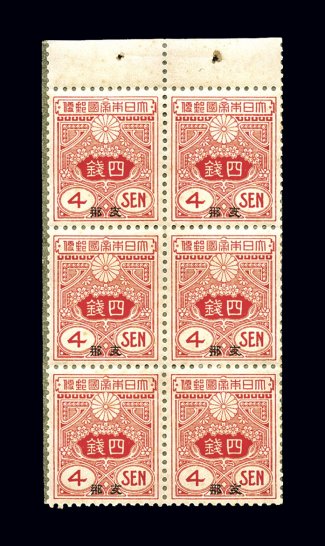 1846 nhBP JSCA # OPB9 imageJSCA #OBP9, 1913 4s Red with China overprint, unwatermarked, handmade booklet pane of six, choice example being well centered, fresh and crisp with full even perforations all around, includes interleaving that is attached to the edge of the selvage as usual, o.g., n.h., extremely fine; a handsome and exceptionally rare booklet pane; catalog value is for a hinged pane (Scott #27 var.) (Image) JSCA 150,000Y