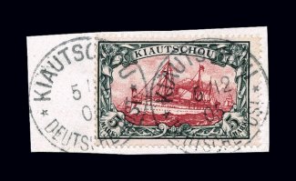 1851 O 22 image#22, 5M Slate and carmine, used example with especially strong brilliant colors, tied to piece by two full strikes of "Kiauschou/Deutsche Post/5 12 05" c.d.s., very fine and attractive (Michel #17; €800). (Image) $475.00